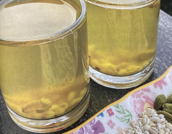 Boil 6 cups of water. Add the barley to the boiling water. Crush the cardamom pods and put the crushed seeds into the boiling water. Simmer on low heat for 15 min.